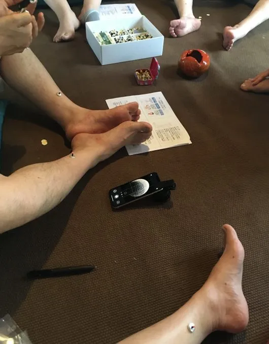 脾経にそって、せんねん灸を置いていきます。